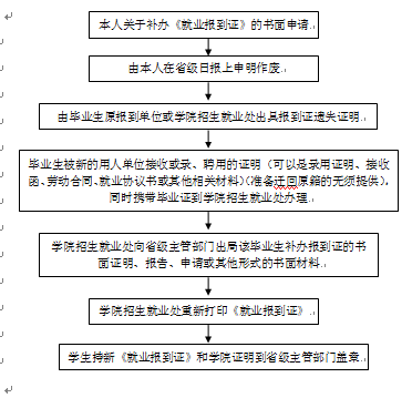 凡取得毕业生资格的毕业生,毕业后两年内因特殊原因将报到证遗失,应由毕业生本人提出申请,在省级日报上申明作废,然后由学校招生就业处上报省级主管毕业生调配部门予以补发。具体流程如下:
